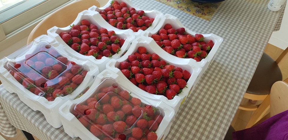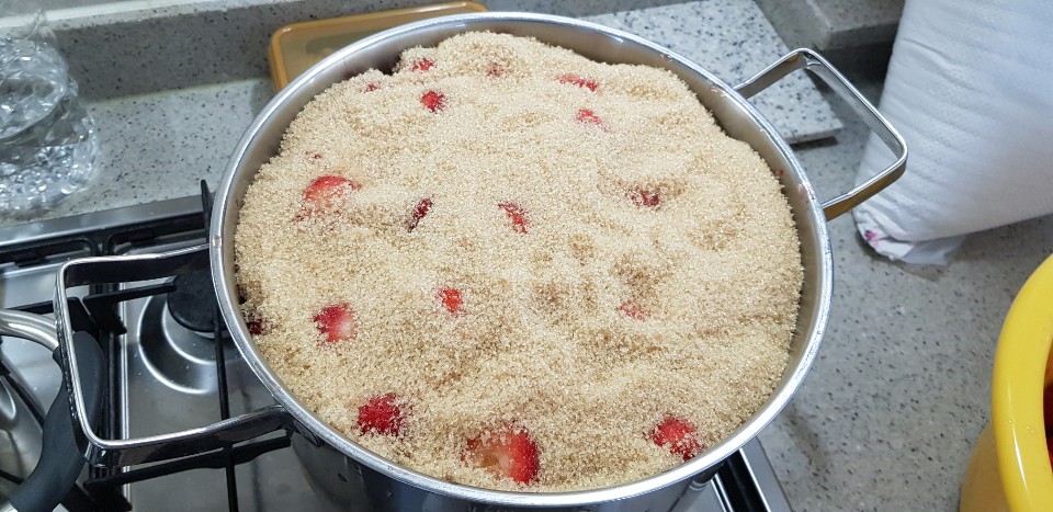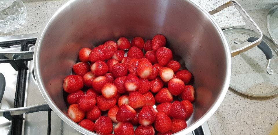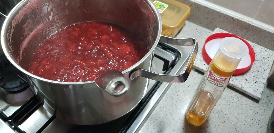 작년에는 12kg 딸기를 쨈으로 만들었고 올해는 5kg 딸기쨈 만들기 도전..올해도 눈대중으로 대충만들다보니.. 미흡한점이 많다. 작년에 만들었던게 더맛있었다. 쨈을 만들고 마지막 꿀로 간을 하는데..너무 많이 넣었던게 잘못되었나보다.