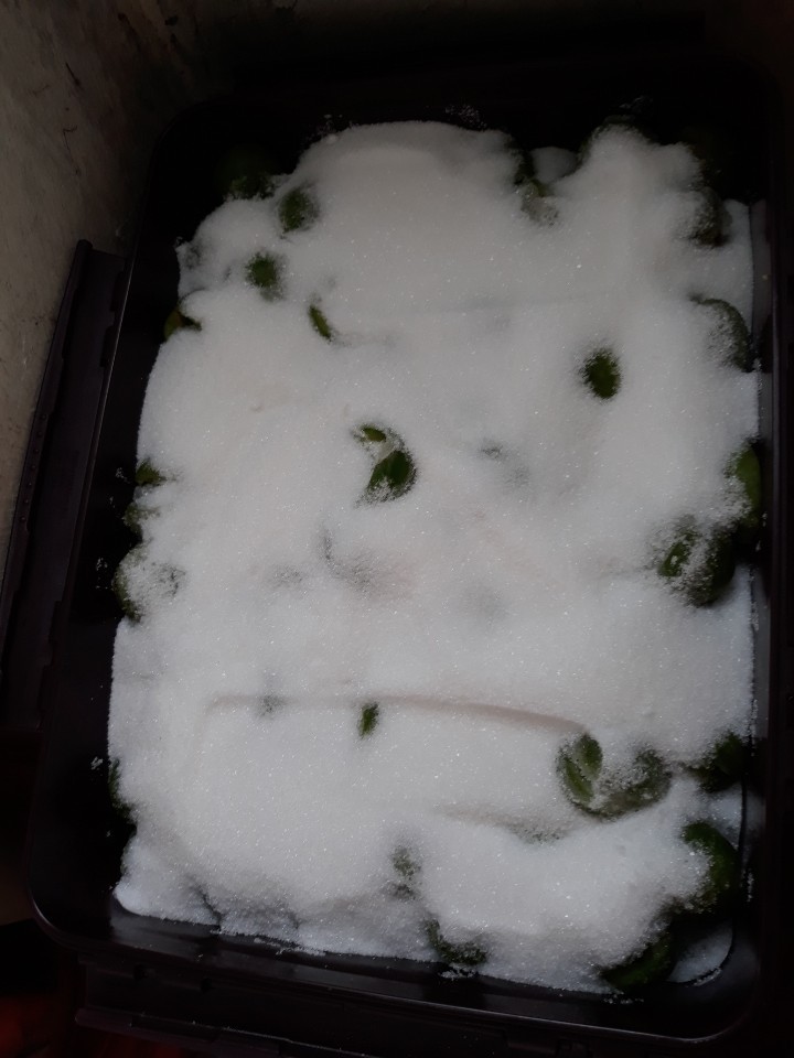 그리고 준비한 굵은소금을 뿌려주고 한시간 정도 두면 매실숨이 죽는게 보일꺼에요