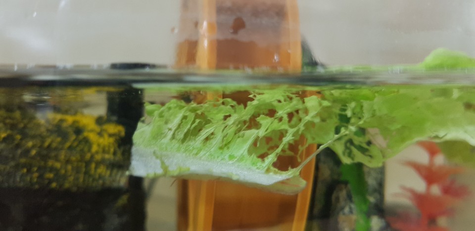 다슬기 먹이를 상추, 양배추, 사과, 청경채 ...다양한 먹이를 줘봤지만 역시 상추를 가장 잘 먹는것 같다.